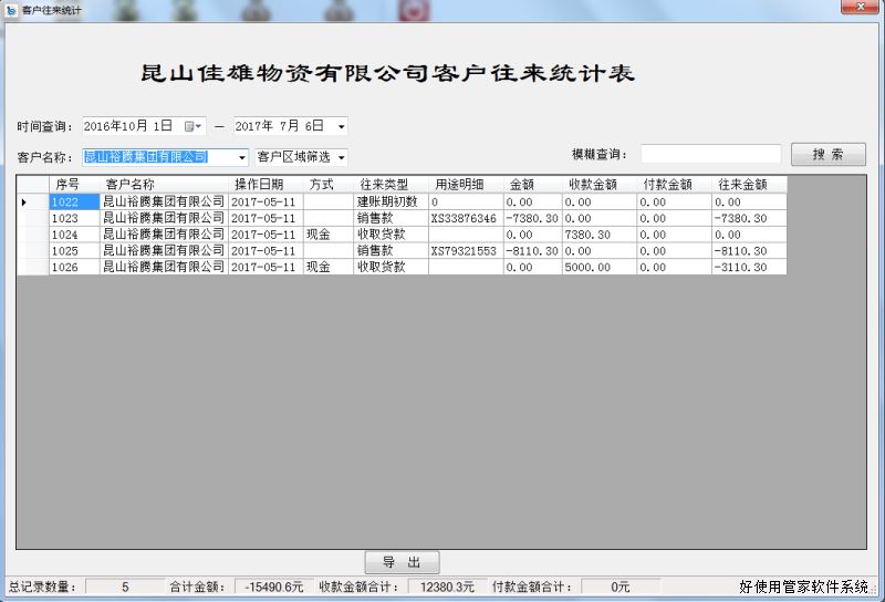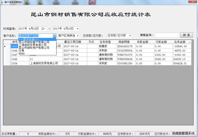 该软件版属多机多用户同时操作版,只要你做采购、销售、收款、付款,软件里所有的统计功能非常完善,包括库存查询、采购明细统计、销售明细统计、客户往来统计、银行往来(包括其它收支)统计、销售业绩统计、应收应付统计、物流费用统计、发票往来统计等应有尽有,而且销售价格只要是同一个客户同一种产品在做单时会记该客户上一次的单价并显示出来。
