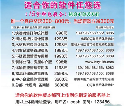15分钟内就会使用的进销存软件价格仅898~1598元/套,是您企业必备的进、销、存、客户往来、应收应付、其他收支:、每人销售业绩、运力费用、及发票往来统计你都一清二楚的一款简版管理软件,且可多个用户不同权限同时使用,二年内不收费第三年起只收每套年费150元,网络版体验…