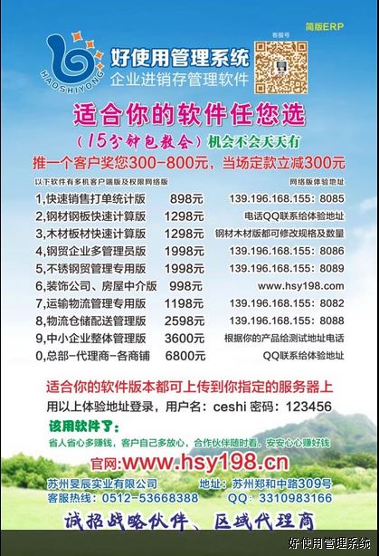 好使用管理软件十五分钟包教会,15分钟内就会使用的进销存软件价格仅898~2598元/套,是您企业必备的进、销、存、客户往来、应收应付、其他收支:、每人销售业绩、运力费用、及发票往来统计你都一清二楚的一款简版管理软件,且可多个用户不同权限同时使用,二年内不收费第三年起只收每套年费150元,网络版体验…
