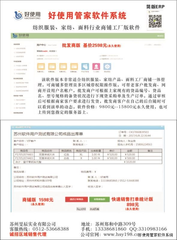 适合中小企业工厂店专用管理软件,该软件版本非常适合纺织服装、家纺产品、面料工厂商铺一体管理,可商铺多管理员多区域带权限操作版,可帮老客户批发商、网商开设用户名帐户,批发商户可根据上家现有的货品编号、货品名、型号规格的备货状况进行下现货采购单及生产订单,通过审核后可根据商家客户要求进行发货,批发商客户在自己的后台随时可以看到该单的动态,软件价格:3600元--9800元永久使用,也可上传到您指定的服务器上。